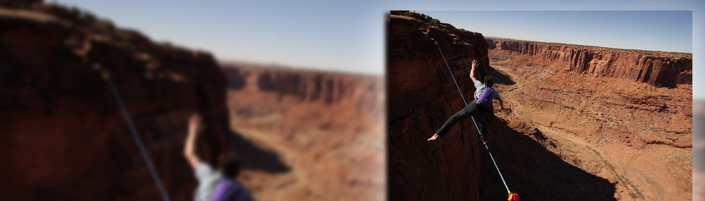 Now he is breaking new ground again. In Hell Roaring Canyon near Moab, Utah, 275 meters above the ground Potter has established the new sport of Baselining – a combination between B.A.S.E.-Jumping and Highlining. He is barefoot and dressed in jeans and T-shirt when he is about to cross the distance of 55 meters with only a parachute to safe him from a deadly fall. If he becomes unbalanced he must pull the rip cord within two seconds to land safely on the ground. 100% pure adrenalin.