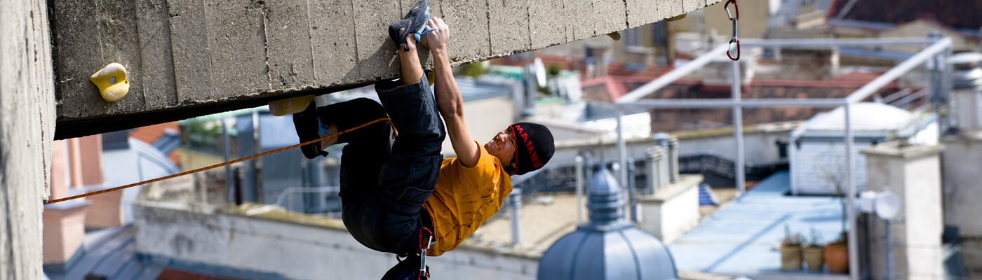 The Mammut team trip has been part and parcel of the E.O.F.T. for two years. This time the international pro team shows that even concrete has a special climbing appeal. The team members become cat burglars and climb buildings, bridge piers and even sandstone sculptures in Vienna and Freiburg.