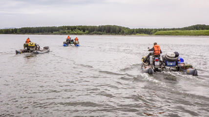 Next to a river somewhere in the Russian Far East stand five people and four sidecar motorcycles.